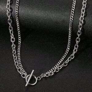 Crafted in sterling silver 925, this layered design pairs a bold oval-link cable chain with a sleek curb chain, finished with a modern toggle clasp