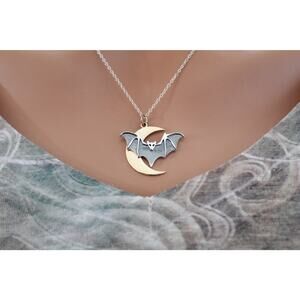 This is Sterling Silver Layer Bat Charm with Bronze Moon Necklace. Both the charm and the necklace are Sterling Silver. This charm is on an 18 inch chain.