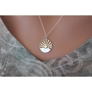 This is a Sterling Silver Mountain Sunrise Pendant Necklace. Both the charm and the necklace are Sterling Silver. This charm is on an 18 inch chain.