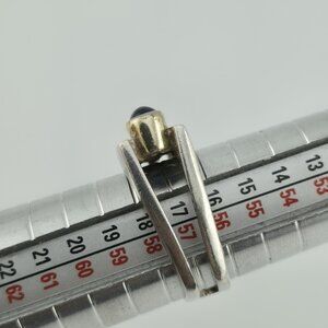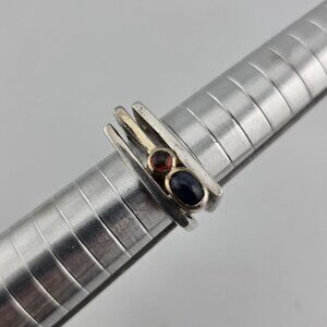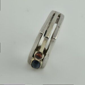 This vintage modernist sterling silver ring features a unique bypass design with two bezel-set stones — one deep blue and one rich red. Its sculptural style and bold lines give it a timeless mid-century appeal, while the stones add a pop of color and personality.