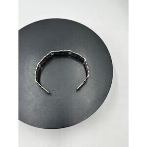 This bracelet features a raised, intricate floral design achieved through the repoussé metalworking technique and given an oxidized finish to enhance the details and create a vintage look. This beautiful piece is marked Sterling in the center.