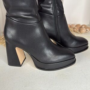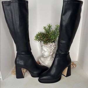 Step out in style with these elegant black knee-high boots. Perfect for any occasion, these boots offer both comfort and sophistication. Size 10 measurements: 16 inch shaft circumference, 16 inch shaft height