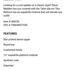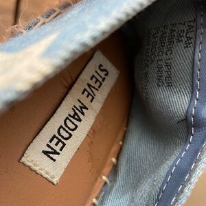 Gently worn women’s size 7.5 Steve Madden talan slide on platform star printed espadrille casual shoes. Minor signs of wear on the insole and outsole, comes from a smoke free home, bundle with other items to save & minimize shipping cost.