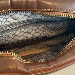 Dark Camel Saddle/Baseball glove color with grommets. Zip top with tassel. Interior zip pocket with snake like interior lining. Excellent condition.