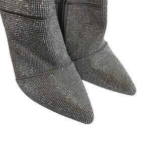 • Features: Winona style bootie by Steve Madden, Inside zip up closure, Pointed toe, Skinny stiletto heels, Silver rhinestone embellished all over, Mid calf height