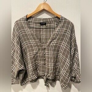 Storia plaid button down tie front top with a flutter sleeve and boxy, oversized fit. Excellent condition.