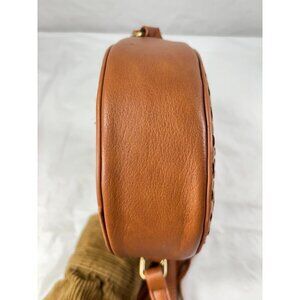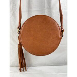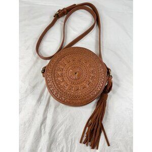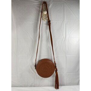 street level Vegan Leather Circular Woven Crossbody Purses in tan 7 x 7 x 2