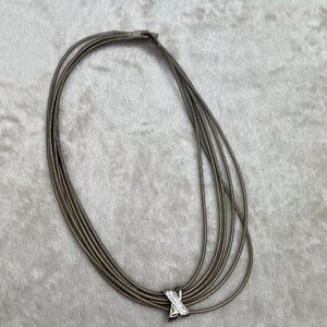 Multi strand necklace in silver tone with rhinestone slider pendant. Stretchy coil wire with clasp closure. Good condition. Approx 15" long.