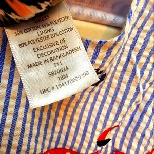Adorable baby dress with blue and white stripes. Features red bow and trim. Comes with matching bloomers. used great condition fits 18months.