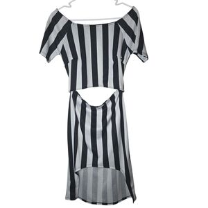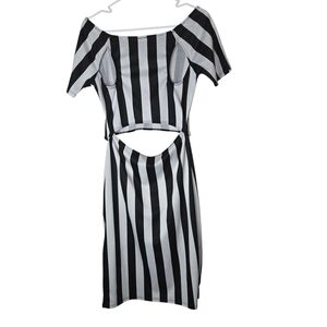 Chic and stylish, this striped midi dress is perfect for any occasion even Halloween. The black and white design offers a classic and sexxy look that never goes out of style. Ideal for both casual and formal settings. Comes with all accessories pictured purse necklace ,earrings and ring!!Can be used for Ms. Beetlejuice/Ms Frankenstein/Sexxy Inmate. Fun and funky. Great deal !!