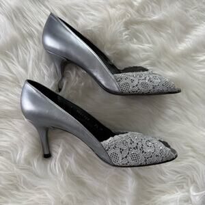 Stuart Weitzman | Women’s Silver Chantelle Chantilly Lace Leather Peep Toe Heels