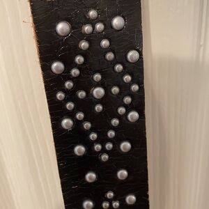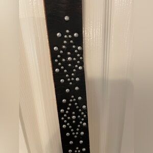 Brown leather. Silver studs. Hammered metal buckle. This is heavy and solid. Size small. Holes are at about the 29-33 inches marks. Belt is 1.75 wide and buckle is about 2.5 inches.