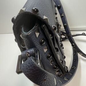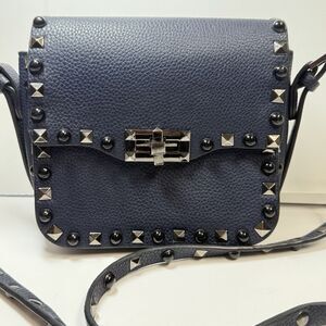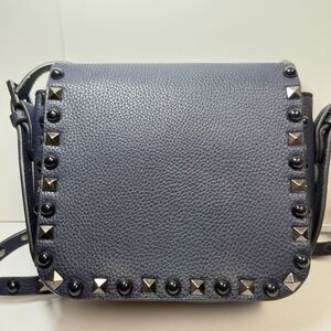 This super cool bag has the best color combination and has a edgy look and feel to it. Comes in a textured faux leather in a navy color and is completely studied with round black studs and gunmetal pyramid studs. Crossbody style with an adjustable strap. Measures approximately 7 inches wide by 7 inches tall by 2 1/2 inches deep. Very roomy and lots of pockets. In great condition but metal turn lock buckle does have some scratches. Also some of the round studs have very faint Scratches. Comes from a smoke free home.