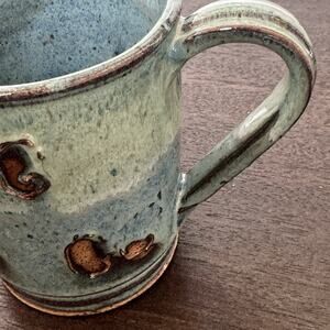Studio Art Pottery Mug Green Brown Raised Abstract Swirl Striped Handle Signed