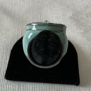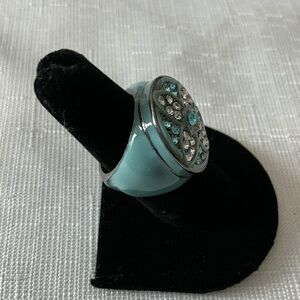 This stunning silver tone and black tone ring features dazzling blue crystals. The blue enameling is well done. The top of the ring has a cross shape with blue and white crystals. This ring is perfect for adding sparkle to any ensemble.