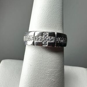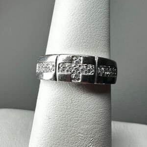 There is a cross design in the center and one row of cz diamonds on either side of that.