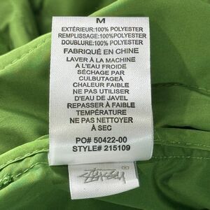 This Stussy jacket is perfect for any occasion, whether you're traveling, going to work or just out for a casual day. The mid-length, quilted design with a solid pattern and green color make it a classic and versatile piece. The jacket features a zip closure, long sleeves, and an oversized collarless design that adds a touch of sophistication.