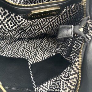 Stylish Black Leather Shoulder Bag With Geometric Lining & Multiple Zippers