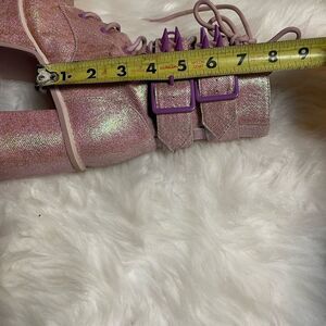 Sugar Thrillz Gothic Platform Pink Glitter lace upBoots lavender spikes & buckles accents SZ6. Side zipper. Pre owned in good used condition no wear see all pictures any questions please message.