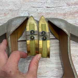 Twilight Zephyr' sandals feature glittering gilded silver leather and studded accents for elevated elegance.