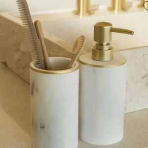This elegant Sunday Citizen bath set features a marble resin soap dispenser and toothbrush holder, perfect for enhancing bathroom aesthetics.