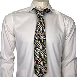 This unique necktie is electrifying! The Nicole Miller design is covered in plugs in shades of green, yellow, white, orange/red, and tan, on a black background. It’s 100% silk and is NWOT.