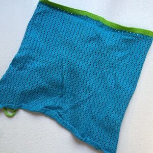 Stylish blue knit tube top with green trim. Features a lace-up front design.