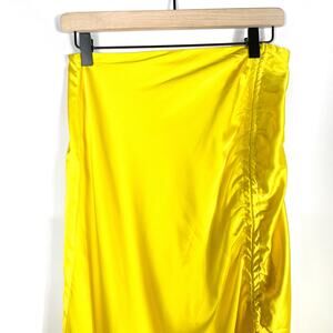 Superdown Kristy Ruched Midi Skirt Yellow Satin Front Slit High Rise Sz S