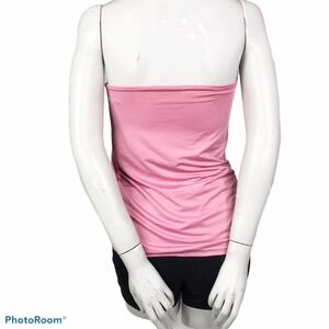 Superdown pink asymmetric strapless top. Stretch jersey fabric. Drapey asymmetric hem.