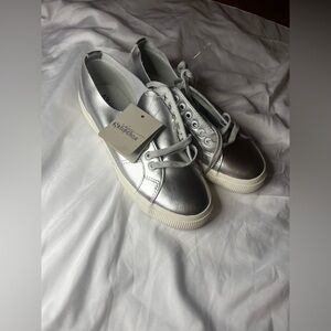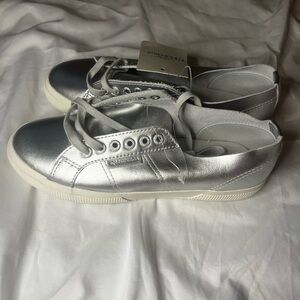 Elevate your style with these metallic silver Superga sneakers. Sleek and versatile for any look.