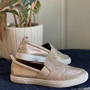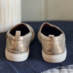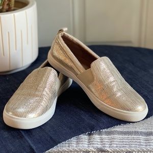 Hard to find classy gold Susina slip on sneakers. Great to wear lounging in the house or under a fancy dress for sophisticated comfort. Super comfy padded insoles for long walks and wandering on vacation. Rarely worn & well cared for, these golden beauties are in close to new condition.