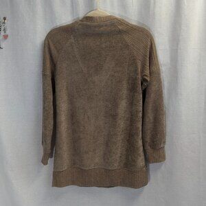 Medium weight sweater, long with slit sides. Lace-up neck, ribbed pattern on upper arms, cuffs, and hem. Great condition!