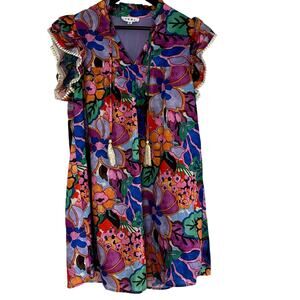 THML Abstract Floral Print V-Neck Dress Tassels Ruffle Cap Sleeve Boho Size M