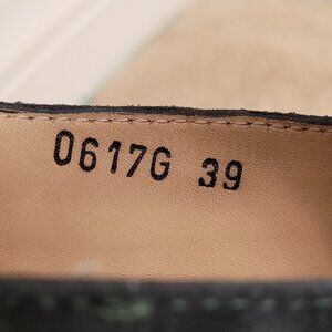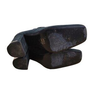 Features: Rare design. This design was sold on Asian & European markets. Suede upper. Leather lining. Leather sole. Silver hardware. Zips at back. Squarish toe. Made in Portugal. Cutout on each side of the shaft. Buckle accent. Metal accent on covered chunky heel.
