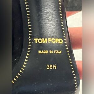 Black suede with a scrappy design along the front open toe, gold wear. 4”heel no tears or stains/box