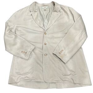 Silk unstructured 3 button blazer sport coat jacket with rayon lining. Two front pockets and three buttons on each sleeve. Excellent condition. Approximate Measurements: chest: 50”