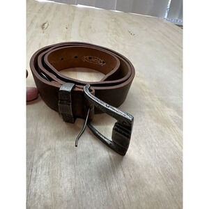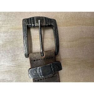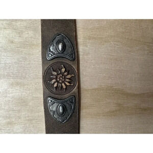 This is a stylish women's waist belt by Topfer, made of brown  leather with a width of 1.5 inches. It features a unique medallion buckle design and other buckle accents, giving it a Western cowboy/cowgirl theme. The belt is size 95 (US 38) and originates from Bavaria, Germany, adding to its distinctive appeal.