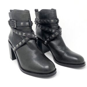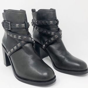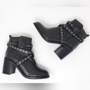 Dark grey leather Tory Burch Hastings ankle boots with round toes, pull-tab at counters, stacked heels and buckle closure at wrap-around straps featuring gunmetal pyramid studs.