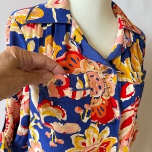Size 4, 100% silk, floral, button front, 2 chest pockets with button closure, long sleeves, roll tab sleeves.