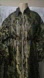 Stylish long coat with a camouflage pattern. Features a zip-up front and gathered sleeves, silver hardware, front zip pocket, elastic gathered waist and sleeve seam. 40