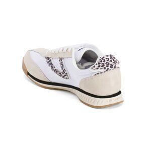 lightly padded footbed and collar, brand logo accents, leopard print accent, suede panels, contrast trim, retro inspired design