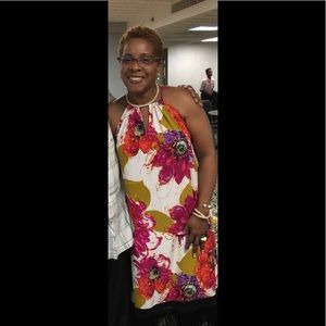 This exuberant hand-painted floral print is in fine form. It's sexy & flowy, 100% silk crepe de chine halter dress features a black fringed hem for pizzazz & pockets for the ultimate in relaxed styling. Approx 53" length, ties at back neck, pockets & lined.  I own this dress in a size 12 and wearing it here. Belted or un-belted