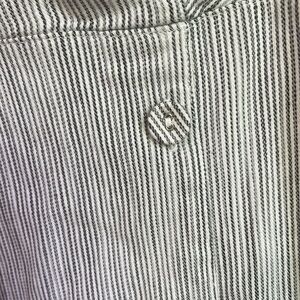 This Tahari linen sundress features a pleated design in a crisp white and grey striped hue, perfect for casual or resort wear. The sleeveless dress boasts a square neckline and a flowing midi length with side slit and button accents, offering a breezy and stylish look for warm weather outings. Women’s size 2 in excellent condition
