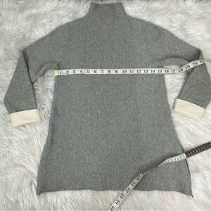 Tahari women’s sweater XS, it has gray with cream color-block 3/4 cuffed sleeves, mock neckline, stretchy, very soft thick fabric and accent zip side hems. Materials 48% viscose, 31% polyester, 21% nylon. Care machine wash cool lay flat to dry. Condition is preloved very good as shown in pictures. Please preview the measurements to ensure fit.