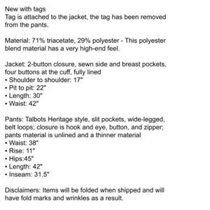 Pants: Talbots Heritage style, slit pockets, straight leg that is considered wide (20” circumference) belt loops; closure is hook and eye, button, and zipper; pants material is unlined and a thinner material