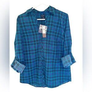 Stylish blue plaid button-up shirt by Talbots. Perfect for casual wear.