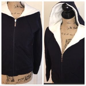 Talbots Petites, Zipper hood, zipper front, She'll 95%cotton, 4% Spandex, Lining 100% polyester, very nice, soft, fleece lined, light weight, not bulky, good condition , machine wash cold, armpit to armpit layflat Measures 20” across.