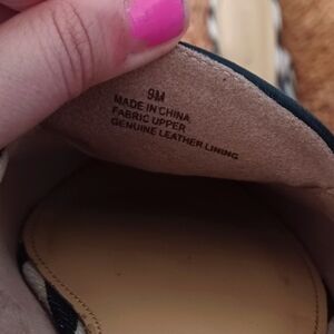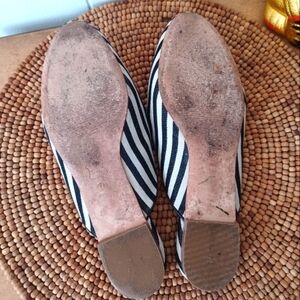Classy yet playful black and white striped slip on mules with an embroidered lady bug accent.