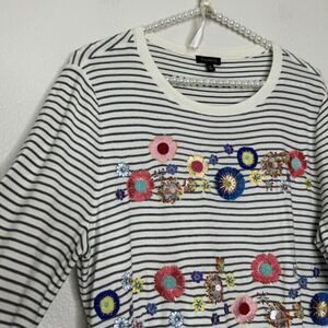 Talbots Top Women's Medium Striped Floral Embroidery Embellished 3/4 Sleeve Blouse