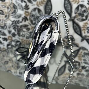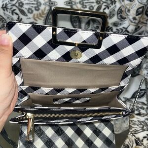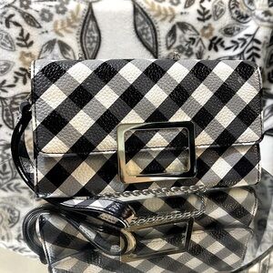 - Black/White Gingham Design, With Gold & Black Lacquered Buckle on the front. Gold tone hardware used throughout.